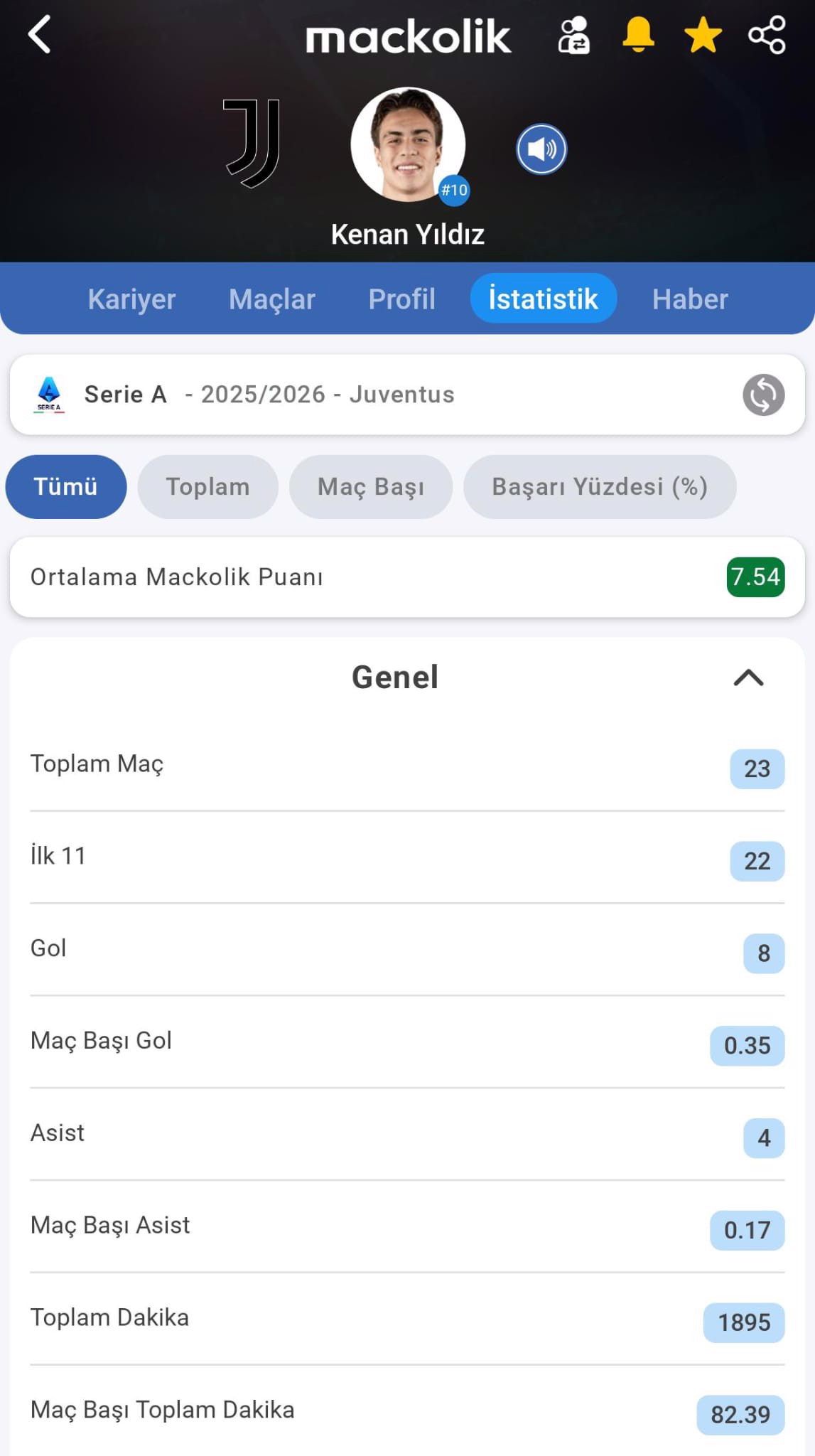 8 gol ve 4 asistlik üretim, oldukça dikkat çekici. Maç başına 0.35 gol ve 0.17 asist ortalaması, Kenan'ın sadece bitirici değil aynı zamanda hazırlayıcı bir rol de üstlendiğini gösteriyor. Kenan, Juventus'un hücum geçişlerinde ve ceza sahası çevresinde en etkili silahlarından biri.