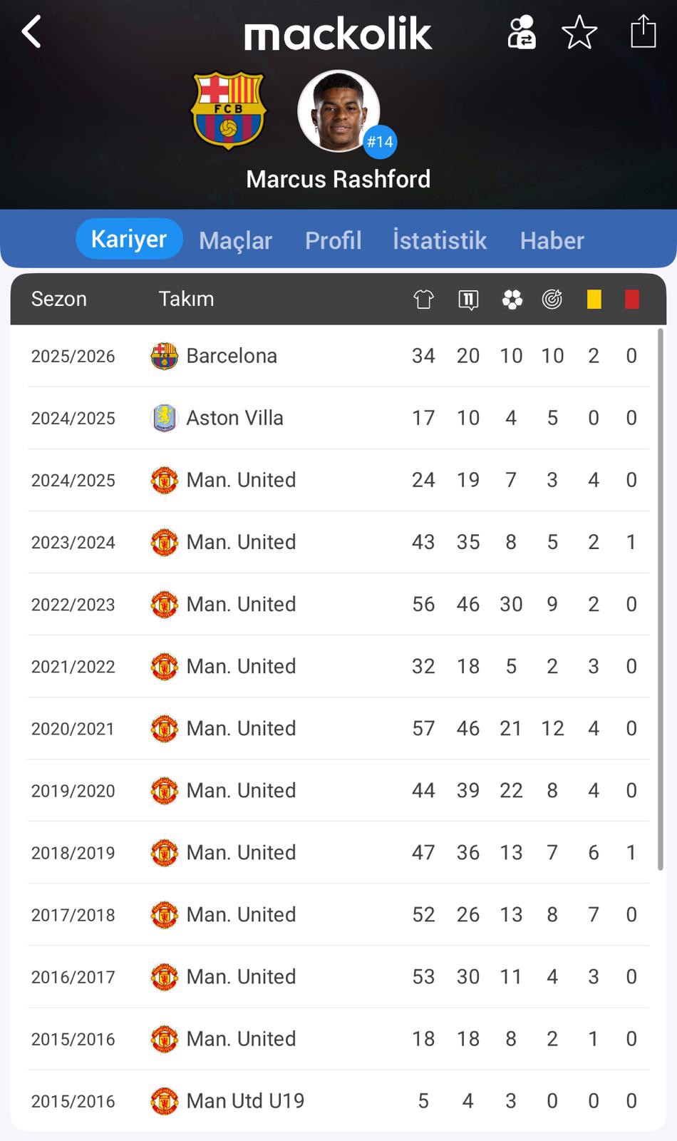 Sezonu İspanyol ekibinde kiralık olarak geçiren Rashford ise performansıyla öne çıktı. İngiliz yıldız, Barcelona formasıyla tüm kulvarlarda çıktığı 34 karşılaşmada 10 gol atarken 10 asist de yaparak takımına skor katkısı sağladı.