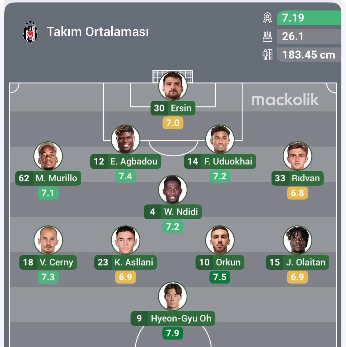 Beşiktaş: Ersin, Murillo, Agbadou, Uduokhai, Rıdvan, Ndidi, Asllani, Orkun, Cerny, Olaitan, Oh